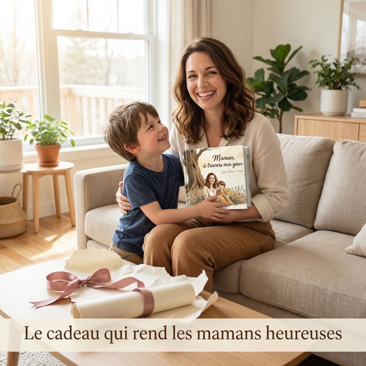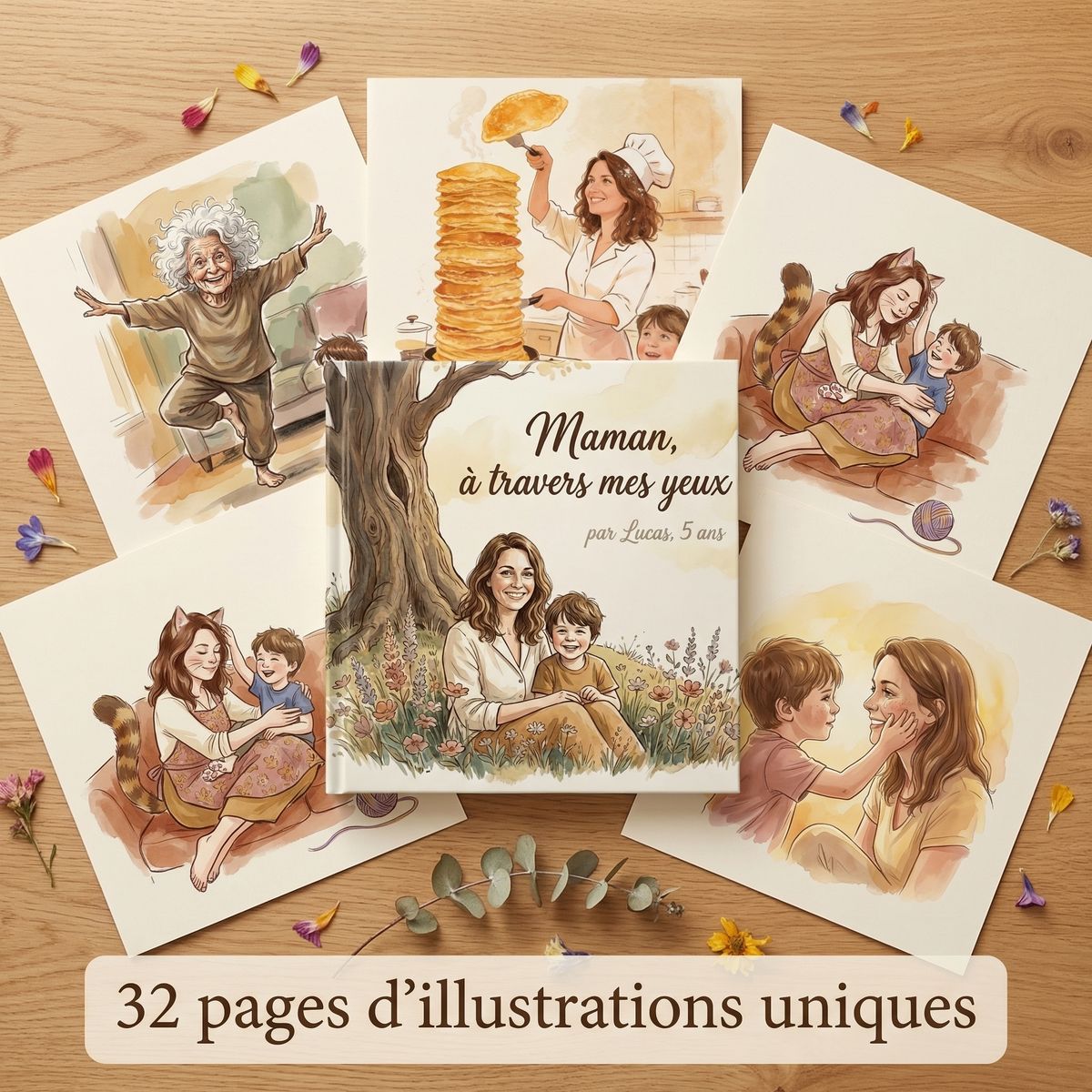 Votre enfant répond à 8 questions drôles et touchantes sur sa maman. Ses réponses deviennent un livre de 32 pages avec des illustrations uniques. Le résultat ? Un cadeau qui fait rire et pleurer. Un objet précieux à garder toute une vie.