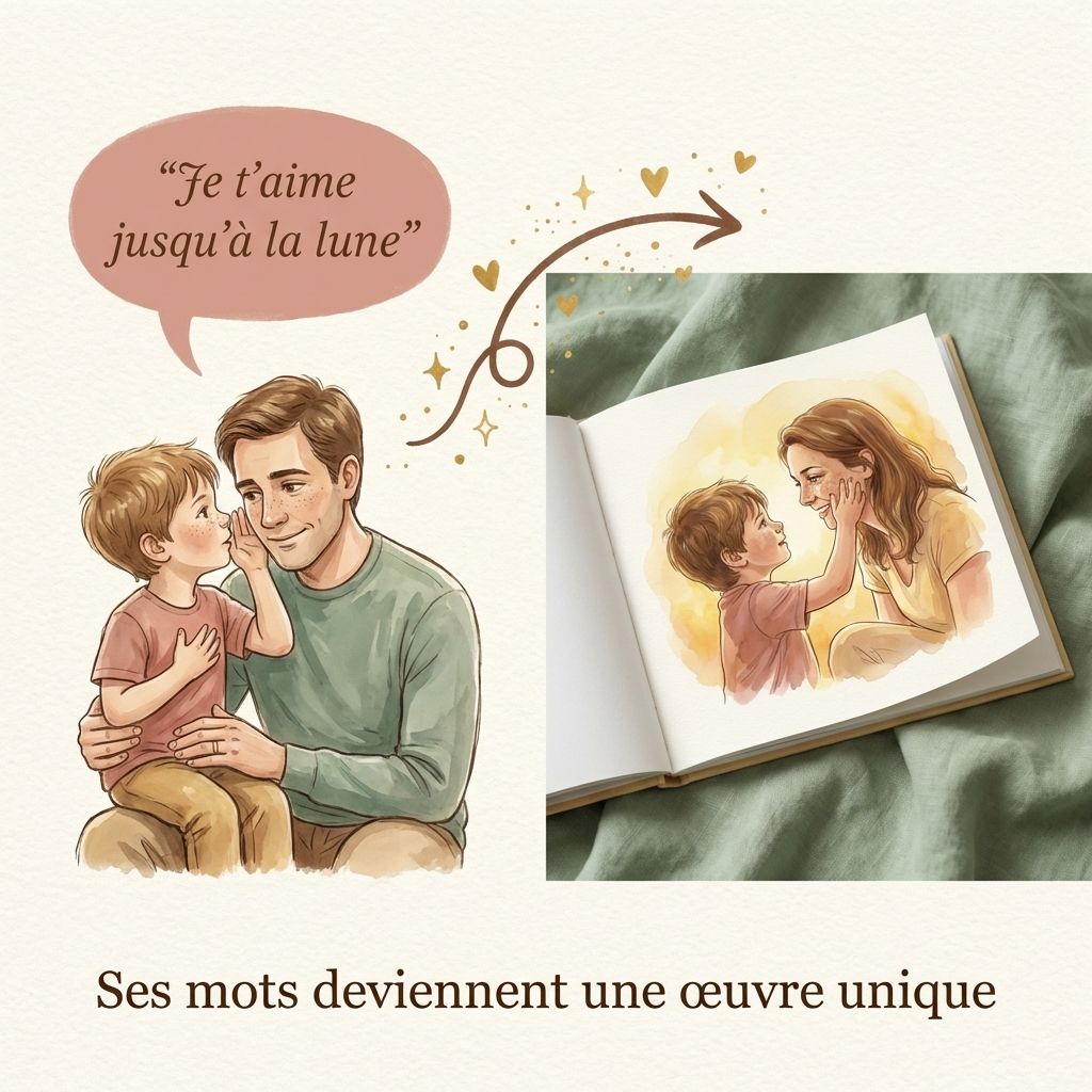 Chaque page est illustrée dans un style aquarelle poétique, inspirée directement par les réponses de votre enfant. Aucun autre livre ne ressemblera au vôtre.